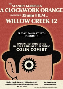 Then we found out about this classic. On Friday, January 28th at midnight, Willow Creek 12 Theaters in Plymouth is showing a screening of Stanley Kubrick’s 1971 masterpiece, A Clockwork Orange. The film will be presented on stunning 35mm film in all it’s early 70’s bizarre glory.